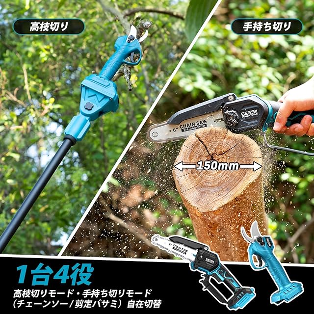 【2025年新登場】SEESII 高枝切りチェーンソー たかえだ 電動バサミ 充電式ハンディチェーンソー 6インチ 高枝切り剪定ハサミ 1台4役 セット 強力 電動のこぎり 軽量 コードレス ブラシレスモーター 延長ポール 125cm~250cm無段階調整 パワフル プロ 伐採 木工切断 庭木の剪定 大容量バッテリー2個付き