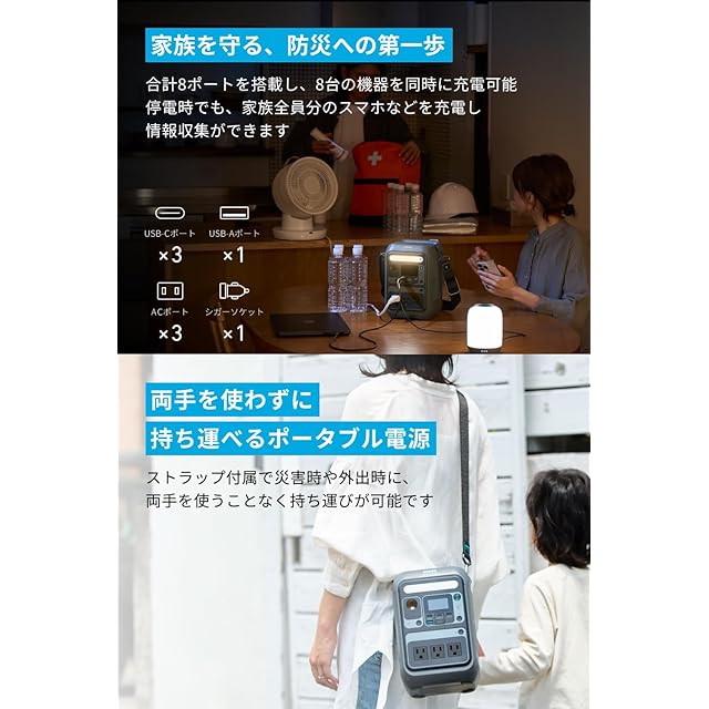 両手を使わずに持ち運べるポータブル電源:ストラップ付属で災害時や外出時に、両手を使うことなく持ち運びが可能です。両手に荷物を持ったり、お子さんの手を引きながらでも、ポータブル電源を持ち運べます。
