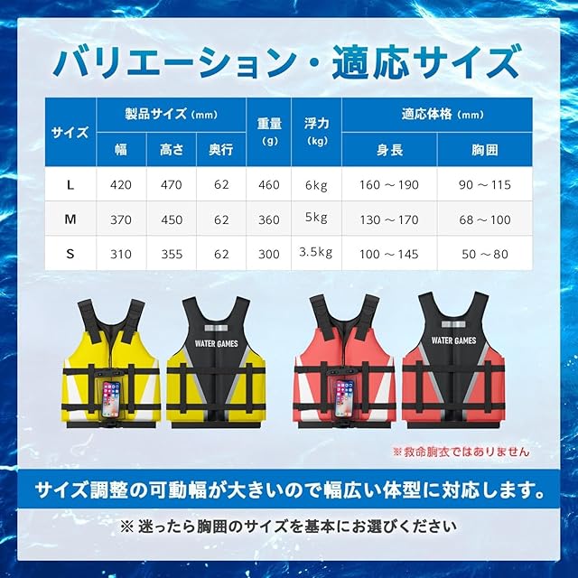 WATER GAMES ライフジャケット フローティングベスト シュノーケリングベスト 大人用 子供用 防水スマホケース 付き 日本国内メーカー 一般財団法人日本船舶品質管理協会 製品安全評価センター 浮力測定実施済 (大人用 Lサイズ/ライムイエロー)
