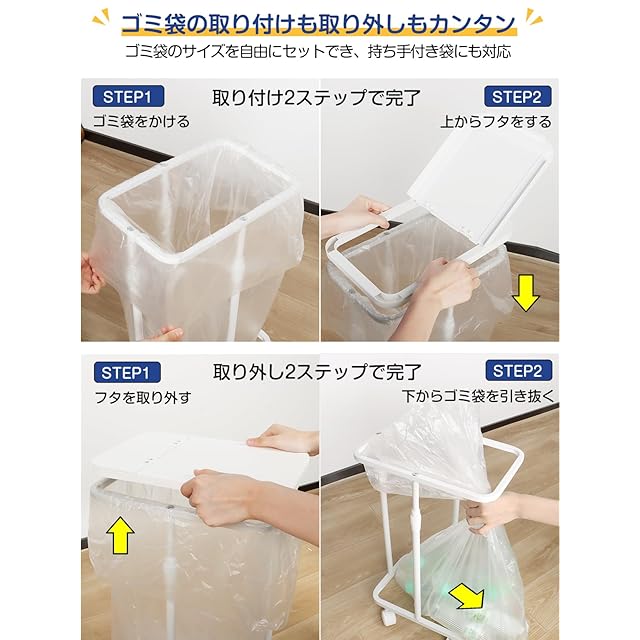 【確認しやすい・漏れにくい】袋の中身が見え、どれだけゴミが溜まったか確認しやすい。袋状のものや袋状になるものならほとんどのものがゴミ袋として使えます。フタをすることでニオイを抑えられ、腐敗臭に虫が寄ることも防止できて衛生的です。
