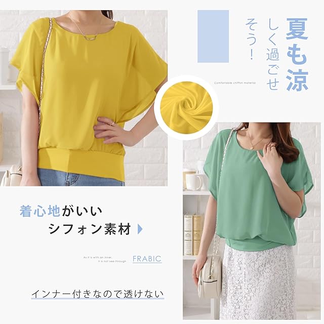 [MEME XTRA] メメエクストラ ブラウス レディース 半袖 シャツ カットソー オフィス 夏 春 シフォン フリル フレア トップス tシャツ 夏服 裏地付 ドルマン おしゃれ 大きいサイズ ゆったり 無地 かわいい キレイめ ジョーゼット 上品