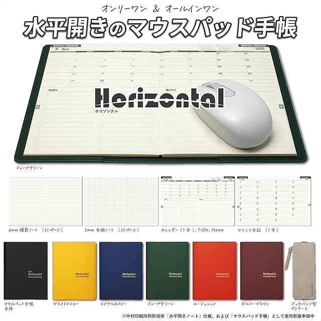 Horizontal 水平開き オールインワンのマウスパッド手帳 [2025年4月始まり] 手触りの良いしっとりレザーカバー 日本製 | (ディープグリーン)