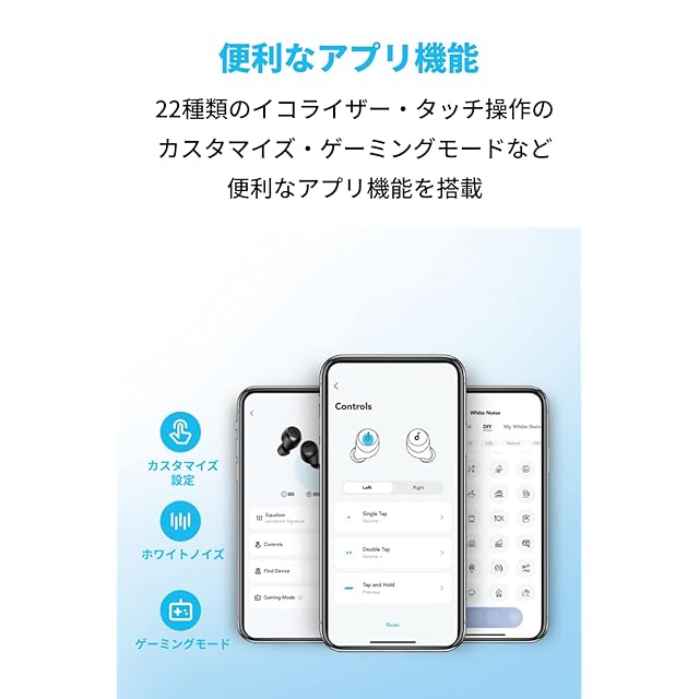 充実のアプリ機能に対応:Soundcoreアプリ上で、22種のイコライザープリセットからサウンドを選択可能。また、イヤホンのタッチ操作もアプリから自由にカスタマイズできます。