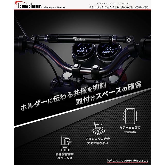 【調整式】 本来の剛性を高める上では六角ナット締め付けによるフィッティング構造での調整機構は望ましくありません。しかしニーズはドレスアップ要素と マウントパーツ の クランプバー として高まる中で、ねじ式は伸ばすとねじ山が見えてしまいルックスに問題があります。そこで Kaedear アジャストセンターブレース ではフィッティング構造を採用し、伸ばしてもスタイルが変わらない仕様としました。 22mm ブレースバー は中央に配置し、 ハンドルブレース を伸ばしても ホルダー 類を ハンドル 中央に寄せて マウント できます。