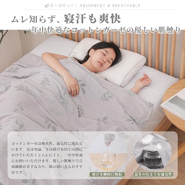 【一年中快適な寝心地】コットンガーゼの柔らかな質感が、一年中快適な睡眠を実現します。ガーゼ素材は湿気を素早く吸収し、熱をこもらせずに適切な温度を保ちます。夏は涼しく、冬は暖かく、その軽やかな肌触りは一年を通じて快適な眠りをサポートします。
