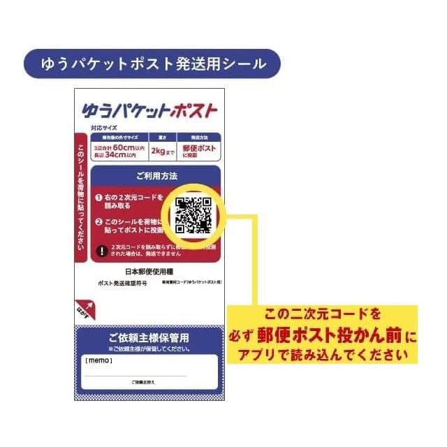 【ゆうパケットポスト用シール】専用シールを手持ちの梱包資材(3辺60cm以内、長辺34cm以内、厚さ3cm以内、2kg以下)に貼り付けてQRコードを読み取ってポスト投函する方法。メリット:匿名配送可能、手持ちの梱包資材が使えます。