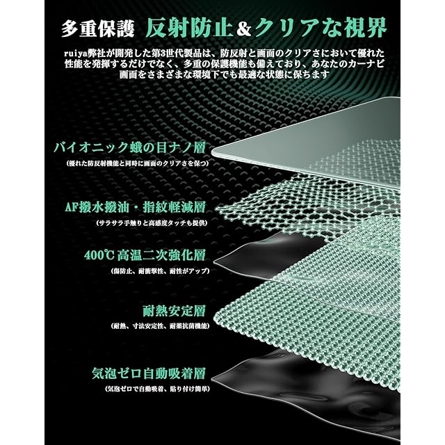 2.【抜群な反射防止・鮮明な視界】弊社の アルファード40 ガラスフィルム はバイオニック蛾の目仕組みと最先端技術を融合し、自然界の反射防止メカニズムを完璧に擬する反射防止フィルムです。これによってさまざまな環境での運転中にも、ナビゲーションの視覚がこの上もない反射防止機能を持ち、同時に見やすさも損なわれていない。日中や夜間の映り込みによる視界の妨げに悩むことはもうありません。アンチグレアフィルムが好きな人に絶対におすすめです。