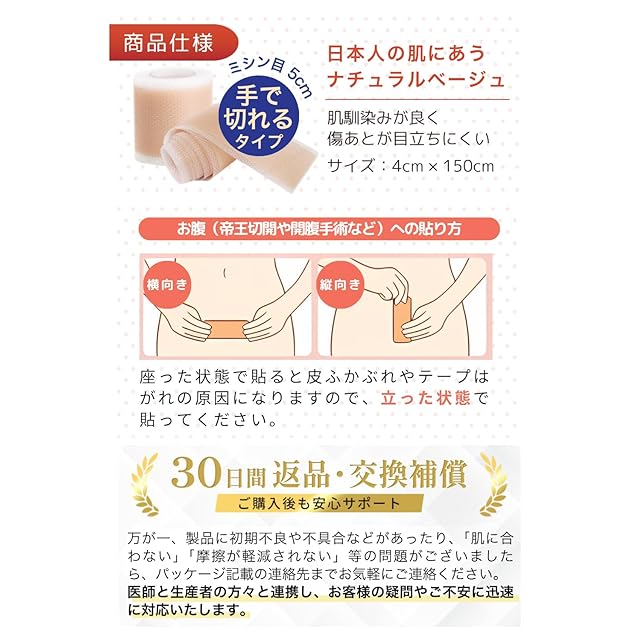 【美容皮膚科医監修】傷跡ケアテープ 帝王切開 【低刺激 × 貼り心地にもこだわった】 『 手で切れるタイプ 』 シリコンテープ 傷テープ 保護テープ 傷隠し ケロイド (4cm×150cm)