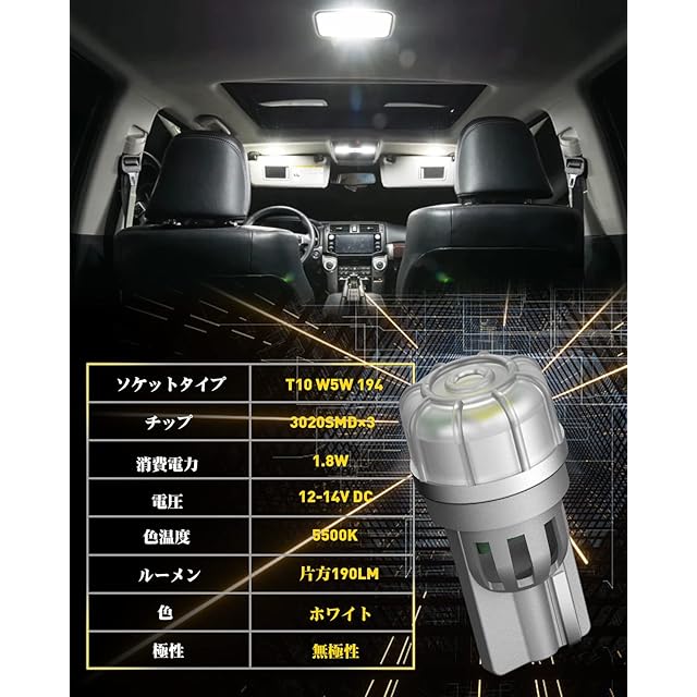 【T10 LED 商品仕様】消費電力:1.8W/色温度:5500K/色:ホワイト/LEDチップ:3020SMDチップ/電圧:12-14V DC/:弊店はご注文日より1年品質ありますし、取付問題、改善意見など、一切店舗へお問い合わせください。24時間以内返答で、新品交換や返金などの解決策がご提供頂します、取付でもサポートできます。ご安心してくたさい。
