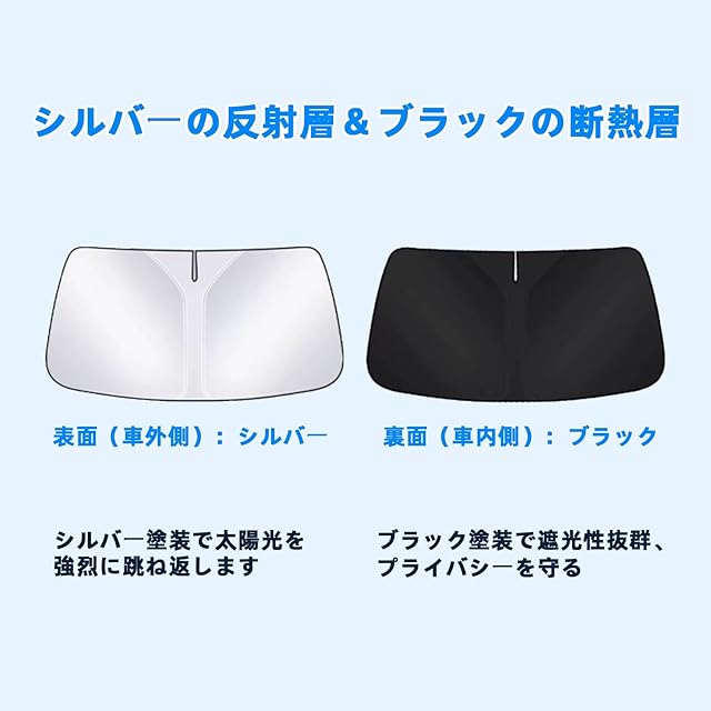 ♪【長持ち高品質素材】①表面:表面には日射しを反射するシルバーコーティングを施し、優れた遮熱効果を実現、温度の上昇を抑え、お肌に有害な紫外線もカット。車内の内装やシートの劣化、熱変形なども防きます。②裏面:落ち着いたブラック生地で車内でゆっくり仮眠や食事をとりたい時にも活用できます。また、長時間車を駐車するときに車内を見えないようにすることで、車上荒らし対策にもなります。