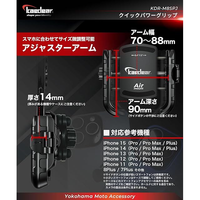 【クイックパワーグリップ/Airマウント】 万力の様に締め付け圧でスマホを固定するのが特徴。レバーを倒した時にスマホがしっかり固定される位置に左のダイヤルを回してアームを調整します。レバーを起こすとスマホを上に抜き取る事ができます。スマホを差し込みレバーを倒すとスマホが固定されます。構造上ホルダーのサイズを小さくできます。標準装備の〔Airマウント〕はエアサスの様なエアーキャップがホルダーをフロートさせ、エンジン振動による高周波を効率よく吸収し、スマホカメラの手振れ補正機能の破損リスクを軽減します。別体のバイブアブソーバーを超える振動軽減効果を発揮しながら、段差などのギャップに対して姿勢の安定性が向上しています。「夏場のスマホの冷却を考慮したい」、「スマホをホルダーに取り付けたままカメラを使用したい。」、「手動でガッチリ固定しないと気持ち悪い」そんな方にオススメなモデルKDR-M8SPJ-Mです。