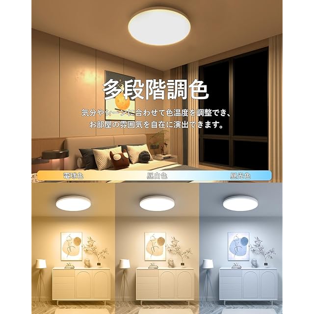 【カスタマイズ可能な照明設定】このLEDシーリングライトは、専用リモコンを使用して明るさと色温度を自由に調整可能です。明るさは20段階、色温度は8段階から選択でき、多様なシチュエーションに応じた最適な照明を実現します。さらに、リモコンには自動メモリー機能が搭載されており、夜間照明や調光、色温度変更後の設定を自動保存。次回使用時には、好みの照明環境がそのまま再現されるため、毎回設定をやり直す手間がかかりません。使い勝手の良さと快適な照明空間を両立した優れた製品です。