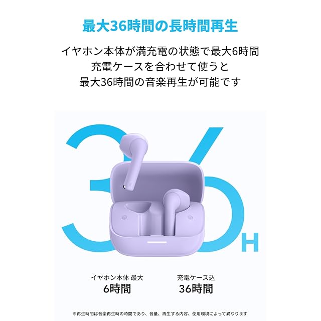 最大36時間の長時間再生:イヤホン本体が満充電の状態で最大6時間、充電ケースを合わせて使うと、最大36時間の音楽再生が可能。また10分間の充電で約2時間の再生が可能な短時間充電にも対応しました。
