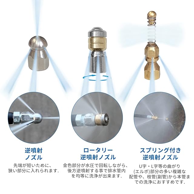 【3タイプノズル】狭いところ、排水管内洗浄、複雑な配管や、枝管(副管)から本管までの洗浄におすすめです。パイプクリーニングホースは、孔より後方に向けて高圧水が噴射されます。噴射した高圧水を動力にして自走し、パイプの汚れ・詰まりを取り除きます。