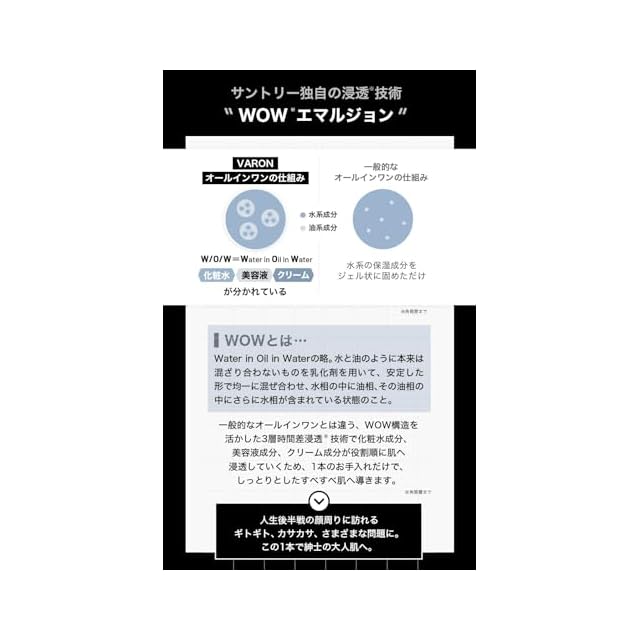 【おすすめする理由3:紳士の大人肌へ導く独自の3層時間差浸透※技術を採用】サントリーは独自の技術「WOW*エマルジョン」で、安定させることが難しかったWOW*(水相・油相・水相)構造を実用化しました。VARONは、他の一般的なオールインワンとは違う、WOW構造を活かした3層時間差浸透※技術で化粧水成分、美容液成分、クリーム成分が役割順に肌へ浸透していくため、1本のお手入れだけで、しっとりとしたすべすべ肌へ導きます。※独自の3層構造により成分を3段階で角層に届けること