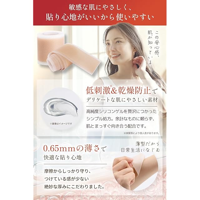 ✅【肌にやさしい使い心地】100%ピュアなシリコンゲルのテープ素材で、余計な成分はゼロ。低刺激設計で、敏感肌やアレルギー体質の方でも安心して使用可能。乾燥を防ぎながら、肌をやさしく守ります。