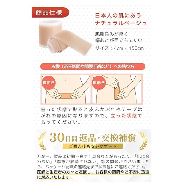 【美容皮膚科医監修】傷跡ケアテープ 帝王切開 【低刺激 × 貼り心地にもこだわった】 シリコンテープ 傷テープ 保護テープ 傷隠し ケロイド (4cm×150cm 2個入り)