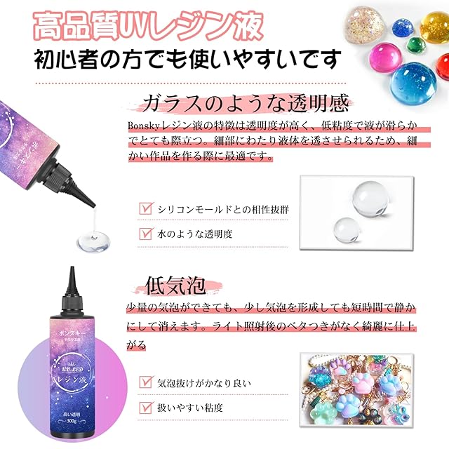 粘度が適当で使いやすい:UVレジン液の粘度が適当で、型に入れやすいです。お客様が好きな色とアクセサリーを自由に組み合わせることもできます。それらはうまく溶け込むことができます。使いやすいです!ボンスキーレジン液は泡立ちにくいです。完璧な小さな尖った口のデザインは手作りDIY愛好家とレジン工芸の初心者に便利です。