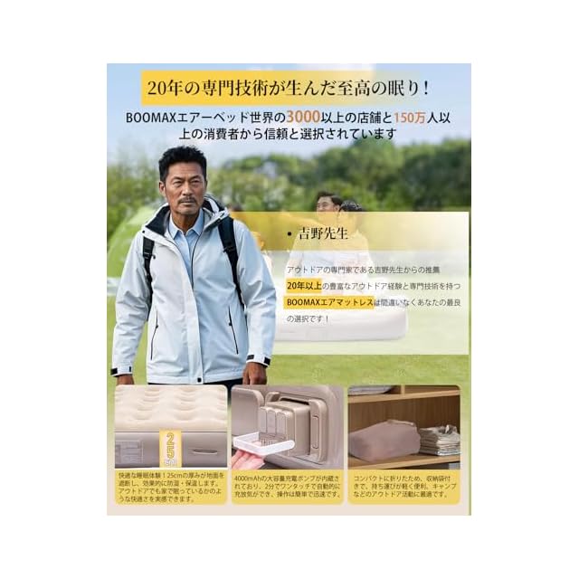 【2025春夏限定·お花見に最適!】BOOMAXの最新作、2025年アップグレード版エアーベッドが新たに登場いたしました。このアップグレードされたエアーベッドは、さらなる快適さを追求しています。最新のテクノロジーとデザインが融合し、2025年版は大容量の4000mAhバッテリーを搭載し、1度の充電で4〜6回の使用が可能です。電動ポンプを使用すると、ワンタッチで簡単に空気を入れたり抜いたりでき、わずか2〜3分で快適なベッドが完成します。さらに、独自の空気調節システムを備え、硬さや柔らかさを自由に調整できます。取り外し可能な電動ポンプにはType-C充電ポートやライト機能(弱光/強光/SOS)も搭載されており、キャンプでも活躍します。花見やアウトドアでのリラックスタイムに最適なこのアップグレード版エアーベッドは、2028年の春夏を彩る最高のパートナーとなること間違いありません。BOOMAXのエアーマットと共に、素敵な時間をお楽しみください!