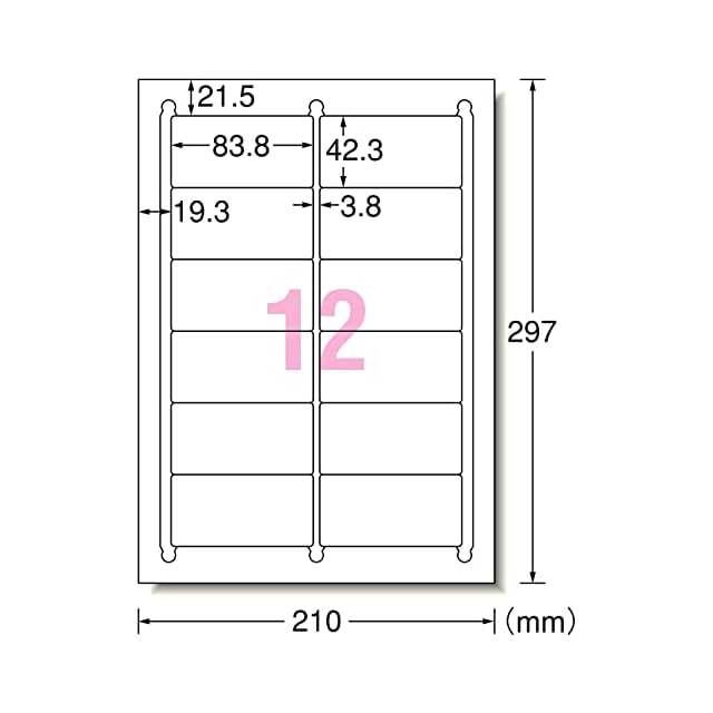 【製品情報】シートサイズ: A4判 (210mm×297mm) / ラベルサイズ: 83.8x42.3mm (2列×6段) 12面 / 入り数: 100シート(1200枚分) / ラベル厚み: 0.07mm