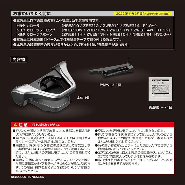 【ドアミラーの視界をさまたげない専用設計】一般的なエアコン吹き出し口に取り付けのドリンクホルダーは、ドリンクを置いた際に助手席側のドアミラーが見えなくなる場合があります。本製品はカローラ専用設計のため、助手席側ドアミラーの視界をさまたげないような位置に設置できます。(ただし、ドライビングポジションが前方側の場合は、大きいサイズのドリンクを置くとドアミラーの視界をさまたげる場合があります。その場合は、ドアミラーの視界をさまたげないように細い缶など背の低いドリンク等のみ置いてください。)
