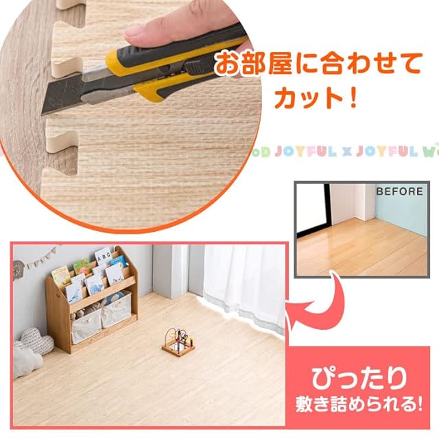 商品の仕様上、ジョイント部分(サイドパーツ含む)の木目の柄は合わない場合がございます。 ジョイントマットに使用する樹脂素材については、より安全な素材となるよう技術の向上がなされており、その過程で現在使用している素材はPEと記載を行うことが適切となりましたので、2019年1月21日にEVAからPEに表記を変更しました。日本の大手量販店でも随時、記載の変更が行われており、品質を悪化させたものではありませんのでご安心ください。 ・床材(塩化ビニル・フローリング等)によって、色移りや変色が起こる場合がございます。床とマットの間に敷物や防護シートを敷いていただくことを推奨しております。 ※2020年2月26日より商品ページでの「大判58cmタイプ」の表記を「大判59cm」に変更をしました。 実際の商品サイズに変更はございませんので、過去58cmタイプをお買い上げいただいたお客様は、そのまま接続が可能です。 ※2022年12月1日にホワイトとライトグレーの販売を終了し、ライトオークとオフホワイトの販売を開始しました。