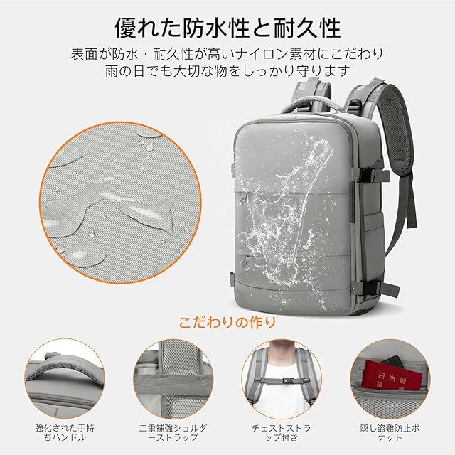 【プロ級の耐久性】撥水素材採用:雨の日の通勤や飛行機の手荷物預け時も中身をしっかり保護してくれます。滑らかなSBSジッパー:全箇所SBSファスナーを採用、スムーズな開閉と長持ちする品質を実現します。高密度ナイロン素材:毎日の通勤リュックとして、コンクリート地面との摩擦に耐える特別加工されて、業界標準比1.8倍の耐摩耗性を実現します。