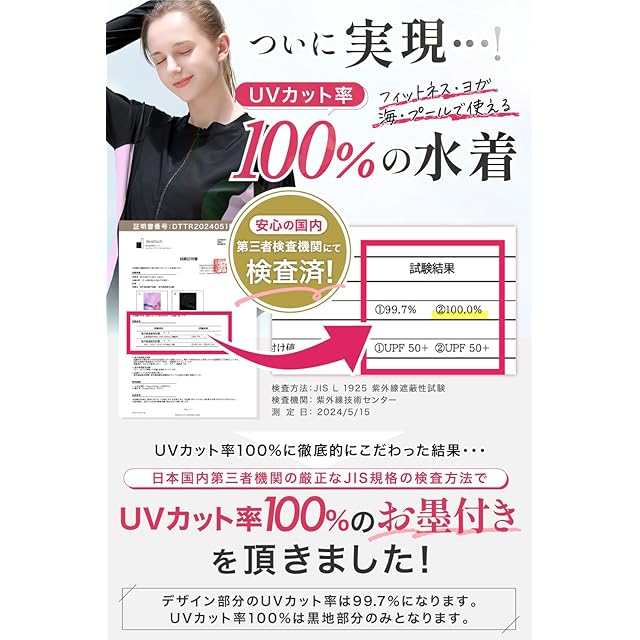✅【国内第三者検査機関にてUVカット率100%の実証済】日本の国家規格、JIS規格1925にてUVカット率100%を実証。日差しから肌を守りたい方のために開発したUVカット水着です。
