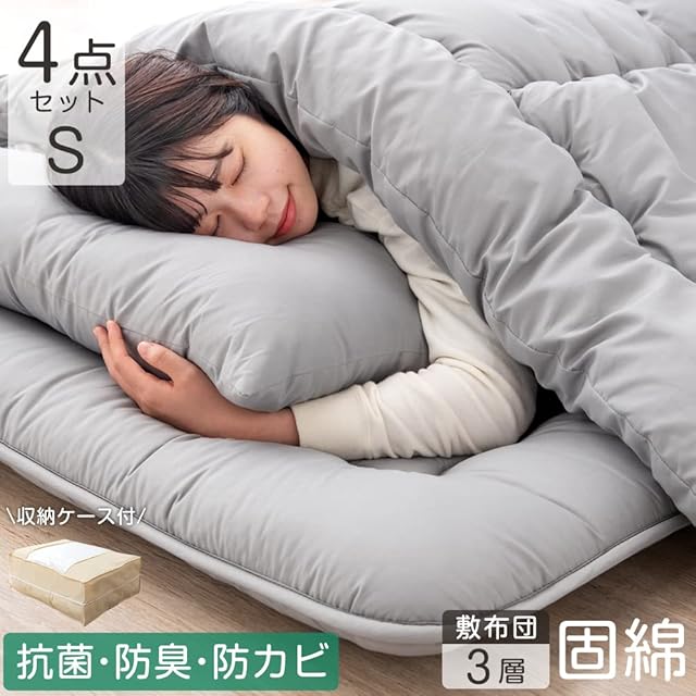 【スタッフのおすすめポイント!】 ・すぐに使える布団4点セット ・高密度固綿入り!底つき感を軽減する三層敷布団 ・ほこりの出にくい中空ポリエステル綿 ・すべて抗菌・防臭生地を使用 ・洗える掛け布団 ・まくらは頭にフィットしやすいくぼみ型 ・ピーチスキン加工で肌触り滑らか ・お子様にも安心の低ホルムアルデヒド仕様 ・ISO9001認可工場による安心の品質 ・収納ケース付き