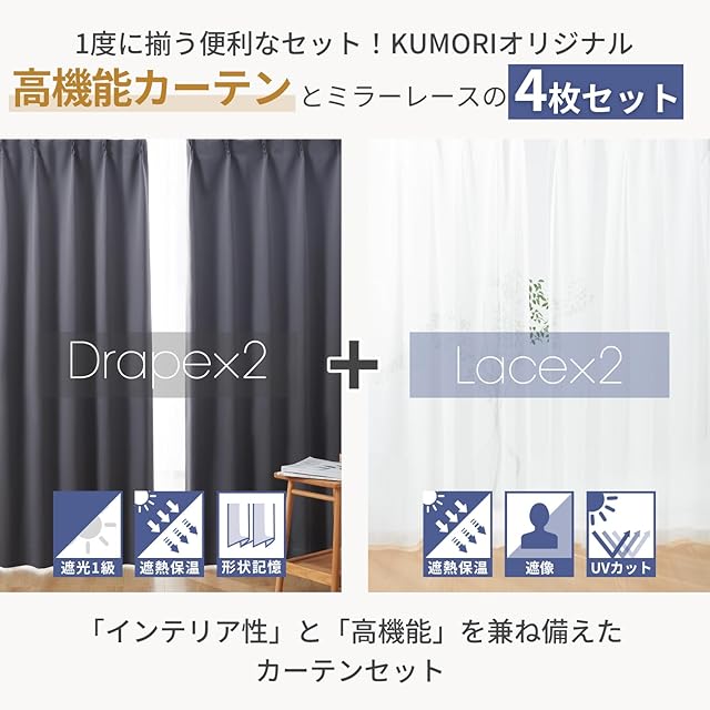クモリ(Kumori) カーテン 4枚セット 遮光度99.99% 1級 遮光カーテン しっかり厚手 断熱 遮熱 防寒 防音 形状記憶加工 UVカット 遮像 節電効果 省エネ 洗濯可能 無地 寝室 リビング アジャスター フック付き(幅100cm×丈110cm・厚地2枚&レース2枚・ダークグレー)