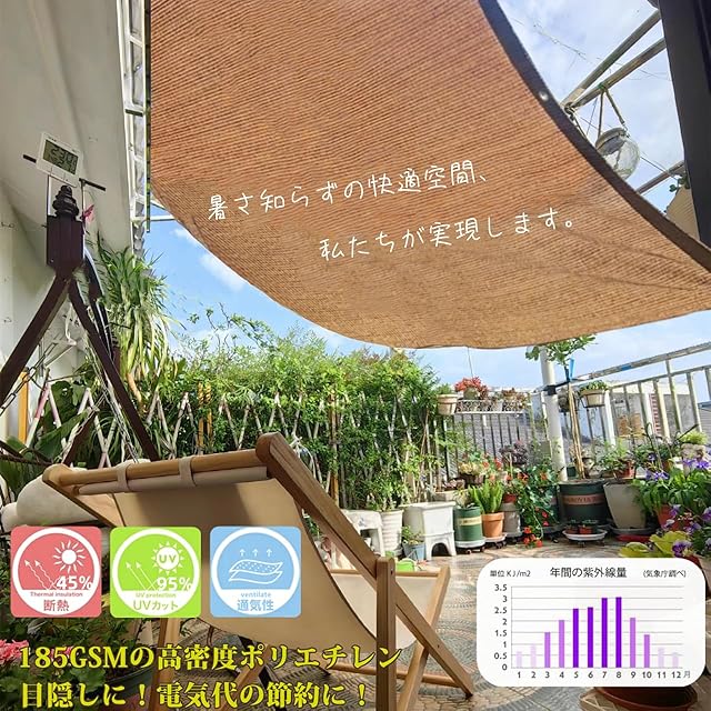 【遮熱効果(45%カット)・日よけシート】高い遮熱効果を持つ生地を使用しており、太陽からの熱や地面からの反射熱を45%カットする日よけシートです。室内の温度が下がり、まるで木陰のような涼やかで快適な空間を演出します。