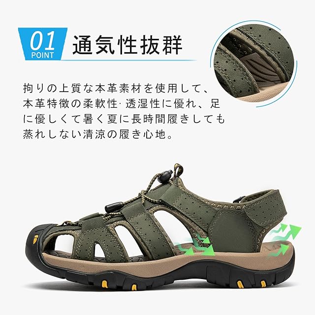 【上質な牛革を精選する】通気性を重視ため、アッパーは水や汚れに強い牛革を採用し、排水でき、蒸れにくく通気性が優れ。本革の味が出る感じが楽しめるといいかなと思っています。この夏はこの1足のサンダルで十分に快適になります。