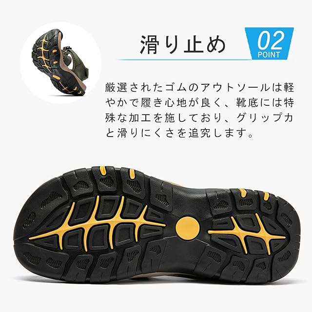 【滑り止め】靴底は素材に滑り止めを混ぜ込み、普通のラバー材質よりも滑りにくく。更に浅い溝と深い溝を組み合わせた特殊な形で地面をしっかりつかむ。水に濡れても滑りにくいので、サンダルのまま川に入っても大丈夫。
