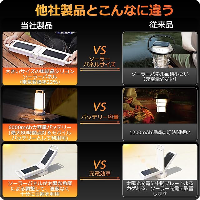 「高効率のソーラー充電&モバイルバッテリー機能」このソーラーランタンは134*63mmの2枚単結晶シリコン太陽光パネルを搭載し、安定した発電効率で蓄電します。ランプ部の取っ手を両方へあけて、隠したソーラーパネルを露出し、太陽光へ向けて発電開始。さらに、ソーラー6000mAhの大容量内蔵電池を備えており、災害用、モバイルバッテリーとしてスマホへの充電も可能です。【※スマホ充電のご注意:アイフォン8以前の機種はスマホシステムの原因で充電受け入れできませんです。アイフォン8以降は通常に充電可能。】