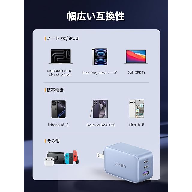 【PD充電器65W+3つのポート付き】UGREENのタイプC充電器はType-Cポートを2つ、USB-Aポートを1つ搭載して、3台のデバイスを同時充電に対応。65Wの出力パワーはパソコンから携帯までの全てのUSB-Cデバイスに充電可能で旅行でも自家用でもこの一つで十分(単ポートも65W対応) .