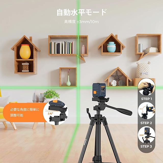 視認性抜群:グリーンレーザーは赤色レーザーに比べて約4倍明るいので、視認性が抜群です。±0.3mm/mの高精度を誇り、細かい作業にも対応できます。壁掛け、棚設置、タイル張りなど、正確な位置合わせが可能です。