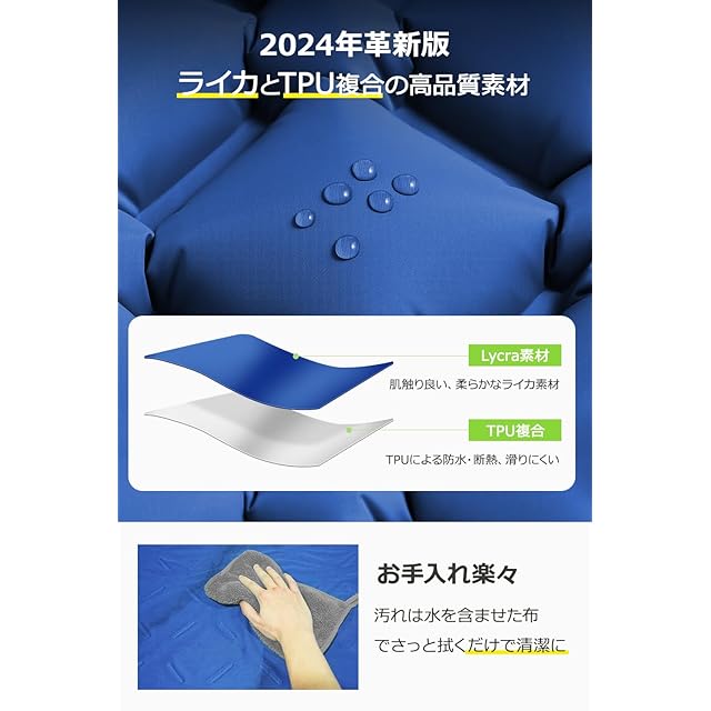 【耐久性&快適性を兼ね備えたデザイン】ナイロンよりも柔らかいライカ布地を使用し、TPUの防水防湿コーティングが施されています。これにより、耐摩耗性が高く、裂けにくくなっています。突然の雨でも安心、表面をサッと拭くだけで清潔を保てます。いつでもどこでも清潔で快適な睡眠を提供。キャンプや登山、車中泊や緊急時の避難所でも、このエアーマットがあれば安心です。