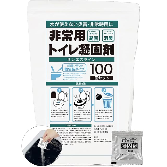 別途「処理袋」があればポータブル トイレ・簡易トイレ・洋式トイレやバケツ、段ボールにセットして使用いただけます。 安心して使える100回分セット(凝固剤100個) 凝固剤は個別包装となっており、使い切りタイプで使用が簡単! 凝固剤1袋で約600ccの水分を固めることが可能です。 水分を素早く固めるので使用後の水分モレの心配がありません。