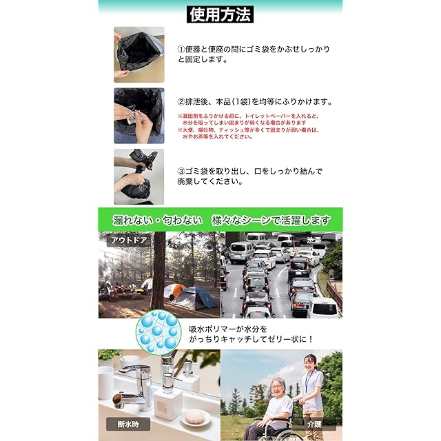 「使用方法」 1.便座を持ち上げ、便器に処理袋をセットしてください。 2.便座をおろし、ズレのないようにしっかりと処理袋を固定してください。 3.用便を足した後、個包装されている袋を破って中の凝固剤を均等にふりかけてください。 ※固まりづらい場合は水を少し足してください。 4.処理袋を取り外し、上部をしっかりと結んで廃棄してください。処理袋をしっかり結ぶことで、臭いモレも防げます。 ( ※ 処理方法については各自治体の条例に従ってください。)