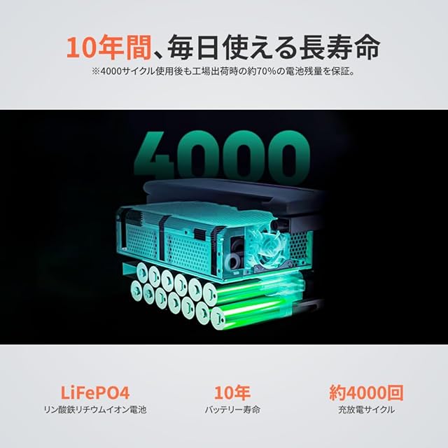【10年長寿命、 リン酸鉄バッテリー搭載】 LFP (LiFePO4)リン酸鉄リチウムイオン電池搭載、毎日充電した場合でも最長10年間使える長寿命。