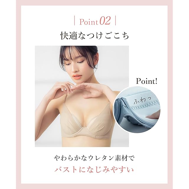 【快適なつけごこち】カップはクッション性のあるやわらかなウレタン素材でバストになじみやすい※「合わせてくれる」とは、前中心の樹脂シートが体温で変形し、バストに沿うことです。