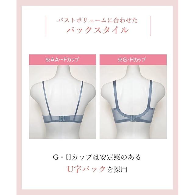ワイヤーあり、後ろ留め、(AA・A・B・C・F・G・H, D・E65-75)ホック2段3調節、(D・E80-85)ホック3段3調節、(AA・A・B・C・D・E・F, G・H70-75)パッド受けあり/パッドあり、(G80-85, H80)パッド受けあり/パッドなし、(A80, B・C80-85, D・E・F・G・H)ボーンあり