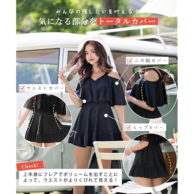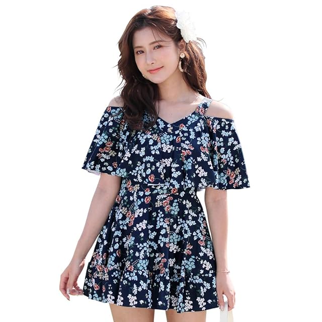 TeddyShop 水着 レディース 体型カバー ワンピース 大人 オールインワン オフショルダー フレア 大きいサイズ hys1515 3XL(15号) K:ネイビー×フラワー