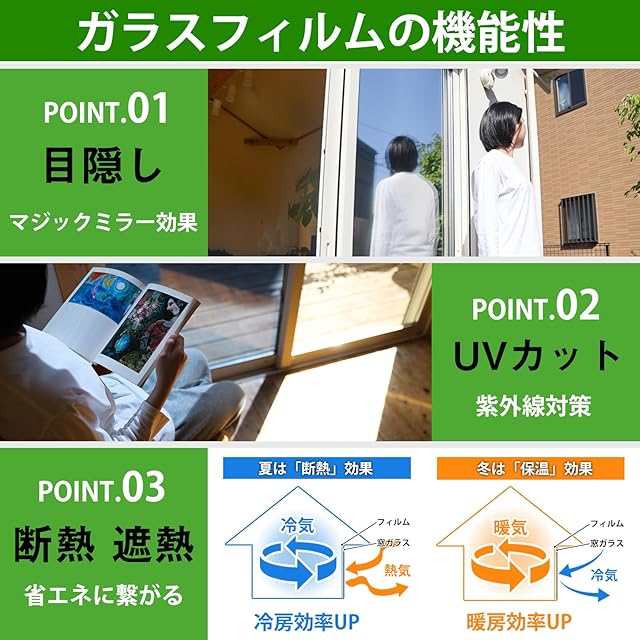 【遮熱断熱シート&エアコン効率アップ】 遮熱フィルムが赤外線(太陽熱)を85%以上反射吸収するので、室内に入る熱を抑え、冷房で涼しくなった室温を保つ事ができます。断熱フィルムは室内の暖房を外に逃がさず、外からの冷気の侵入を抑える効果があります。室内の温度差を小さくし、冷暖房設定温度の緩和が可能になり、エアコンのコスト削減に繋がります。