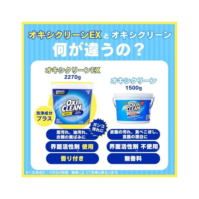 【ダブルパワーの洗浄力】オキシクリーンEXは漂白剤成分に加えて、界面活性剤(汚れを落とす成分)が入っていますので、ダブルのパワーがしっかり汚れを落とします。泡立ちが良いのもオキシクリーンEXの特徴です。