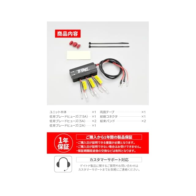 ●商品構成:ユニット本体×1、低背ブレードヒューズ(7.5A)×1、低背ブレードヒューズ(5A)×2、低背ブレードヒューズ(2A)×1、両面テープ×1、結線コネクタ×1、結束バンド×2