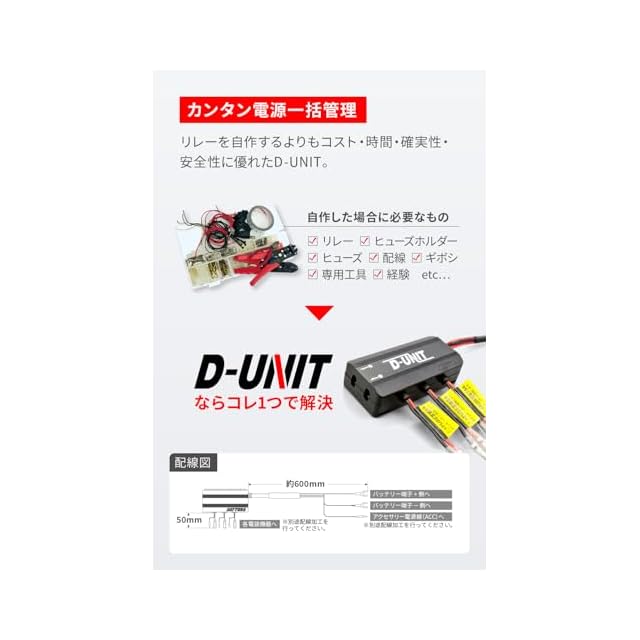 ●合計20Aの高出力:主電源をバッテリーから直接取ることにより、純正電装機器への負担を減らしながら、高出力を可能としています。