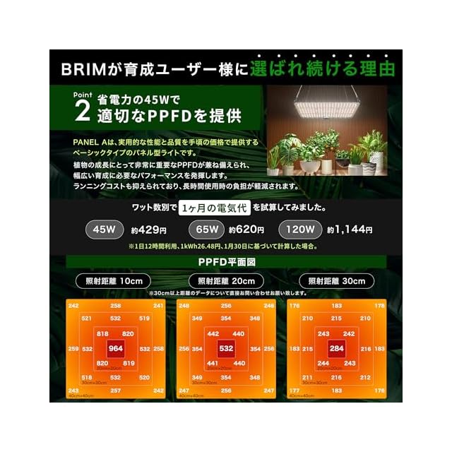 【45W/65Wの電力で的確なPPFDと照度】数ある植物育成ライトの中でも広い照射範囲を持つパネルタイプは、植物の成長に欠かせないPPFDを広範囲で均一に提供でき、育苗から観葉植物や多肉植物など幅広い使用シーンに適しています。45W/65Wの消費電力でランニングコストを抑えられており、電気代の節約にもつながります。