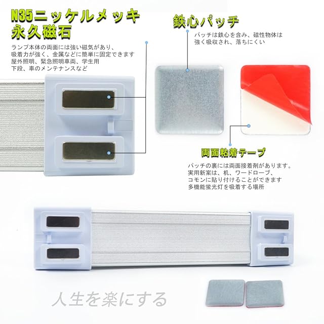 【マグネット付き&取り付け簡単】:LED蛍光管の両端に4つのN35磁石があり、金属表面にパッチリ吸着できます。落とす心配がありません。(テープの鉄片を付いたから、キッチンライトをお好きな所に取り付けます。LEDライトを取り付け/取り落とすことはとても便利です。)キッチン、クローゼット、ワードローブ、テーブル、廊下などに設置で照明用ライトとして使えます。外出時の懐中電灯としても使用できます。キャンプ、夜釣り、登山、機械修理などの時用に大活躍です。軽量で小型で出かけるときに持ち運びが便利です。