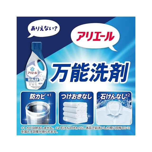 万能洗剤 1本で(1)洗濯槽防カビ、(2)つけ置きなしでも蓄積臭はがす、(3)せっけんなしでもシミ一発スッキリ *P&G調べ。ニオイの度合いで消臭の程度は異なります。汚れの度合いにより、汚れ落ちの程度は異なります。カビは除去できません。